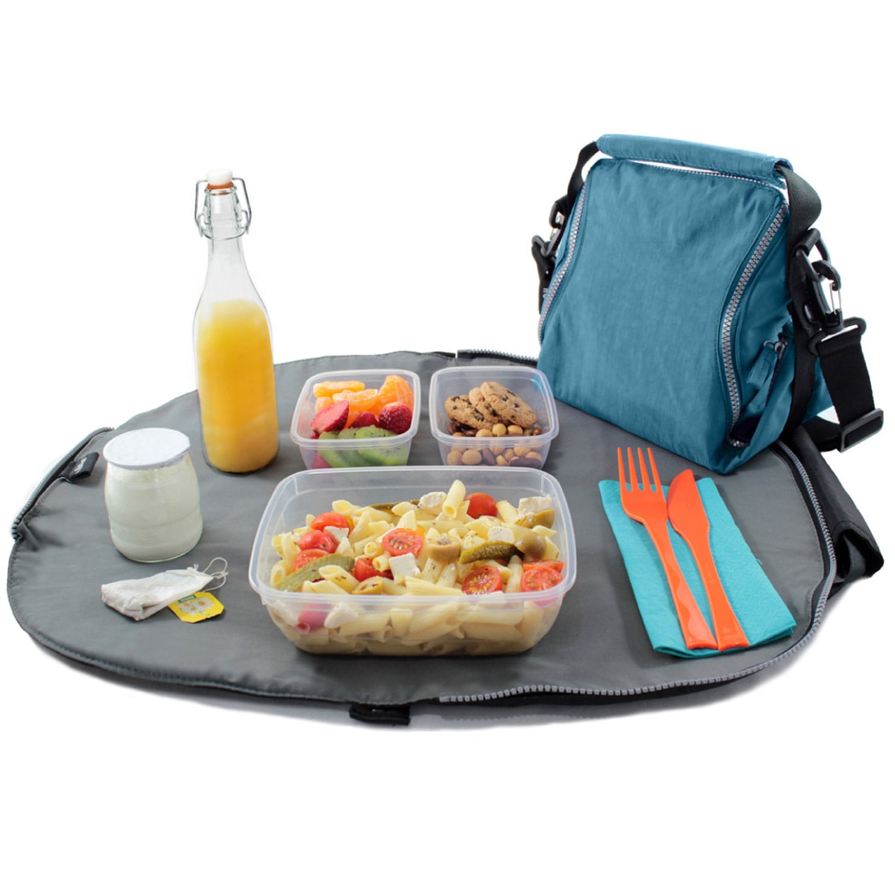 お弁当箱専用のバッグ、2in1ランチバッグをご紹介。見た目もスタイリッシュでファッションの一部にもなります。広げればランチョンマットにも早変わりするため、かさばるランチョンマットやハンカチを持ち歩く必要がありません。
