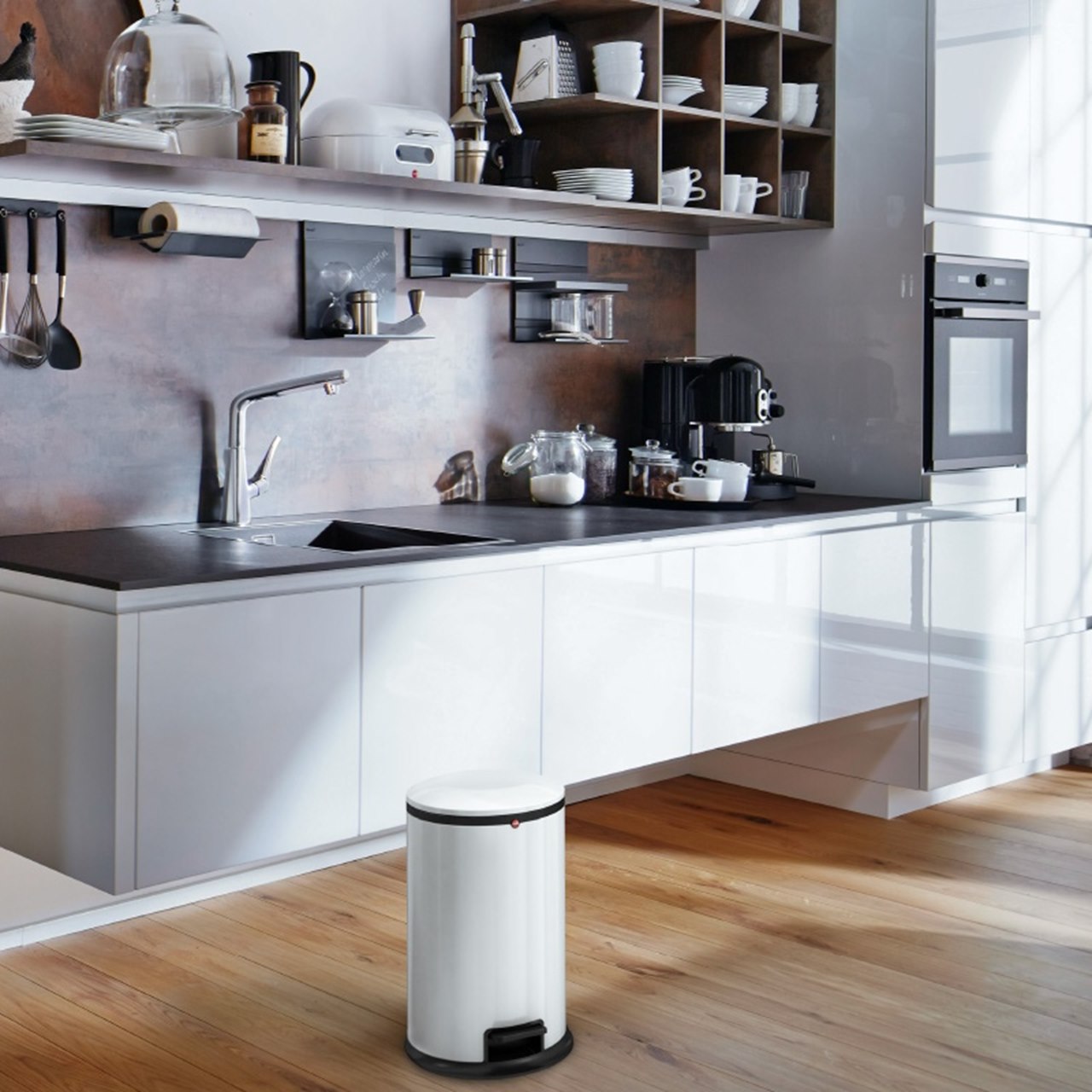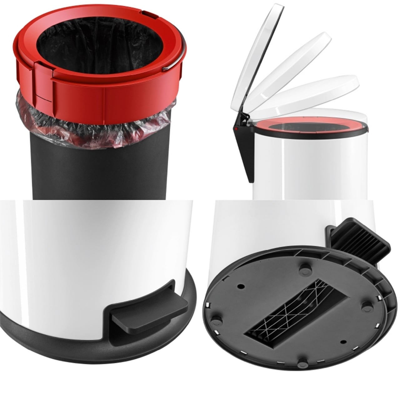 底面には4ヶ所に滑り止めが付いて、フットペダルを踏んだ時にゴミ箱が動くのを防ぎます。蝶番部分は持ち手にもなっており、ミニマムなデザインでも多様な機能を備えています。