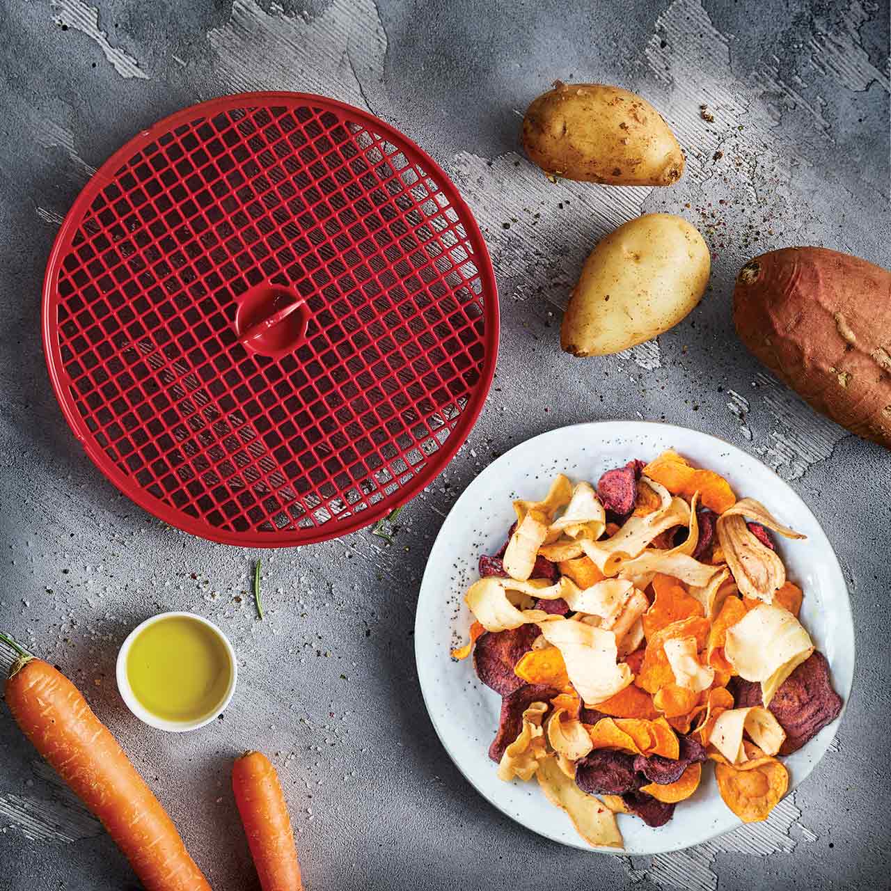 最も薄い設定にしたBörnerスライサーでお好みの野菜をスライスし、クリスピーメーカーにスライスした野菜が重ならないように並べます。電子レンジに入れ、数分もすれば、あっという間に自家製チップスの出来上がりです。お好きなスパイスをふりかけるのもおすすめです。