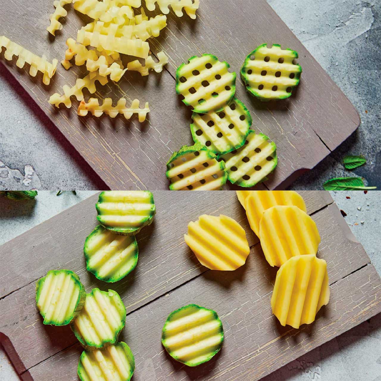 さらに、ウェーブカットした食材を全て重ね、90度回して横からもう一度スライスすると、スパイラルヌードルができます。