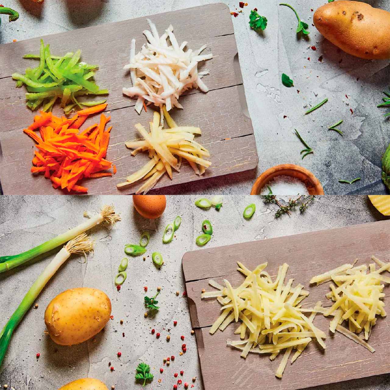 生または下茹でされたジャガイモを簡単においしい料理に変えることができます。サラダやおかずにしたい、にんじんやきゅうりなどの野菜を、美味しそうな形にスライスします。