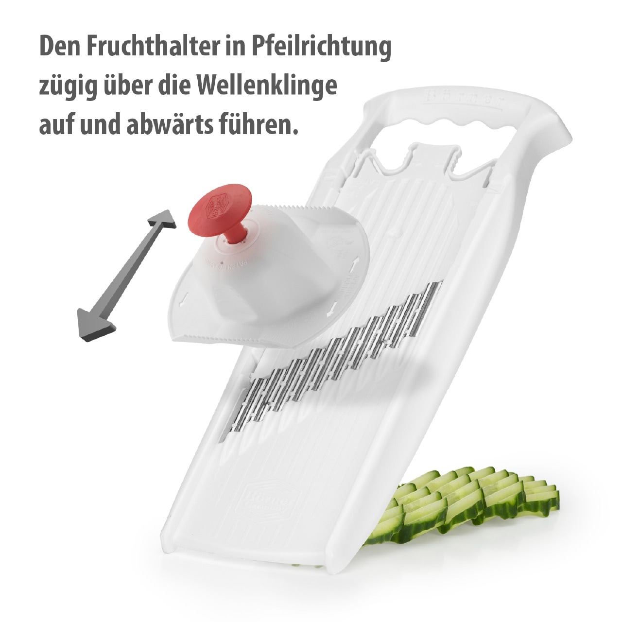 シンプルに上下に食材を動かすだけで波型の刃がウェーブカットを実現します。
