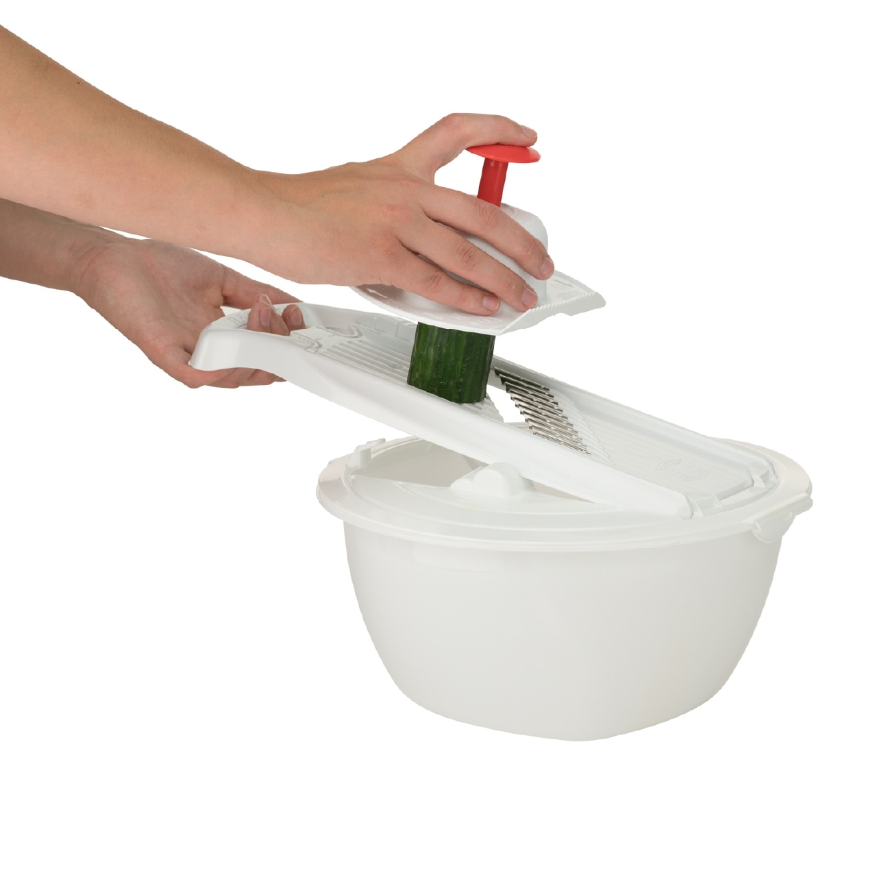 安全ホルダー内部のスチールバーに野菜や果物を刺します。 持ち上がったボタンを押しながらスライスすると、野菜が小さくなっても最後までスライスできます。
