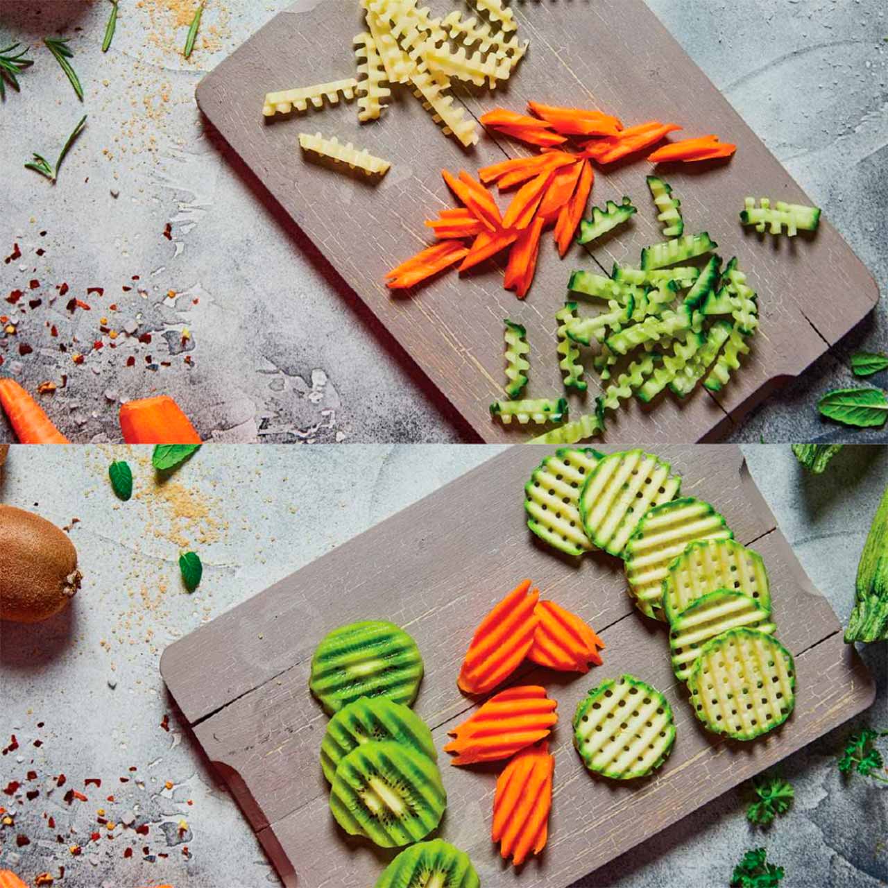 シンプルに上下に食材を動かすだけで波型の刃がウェーブカットを実現します。