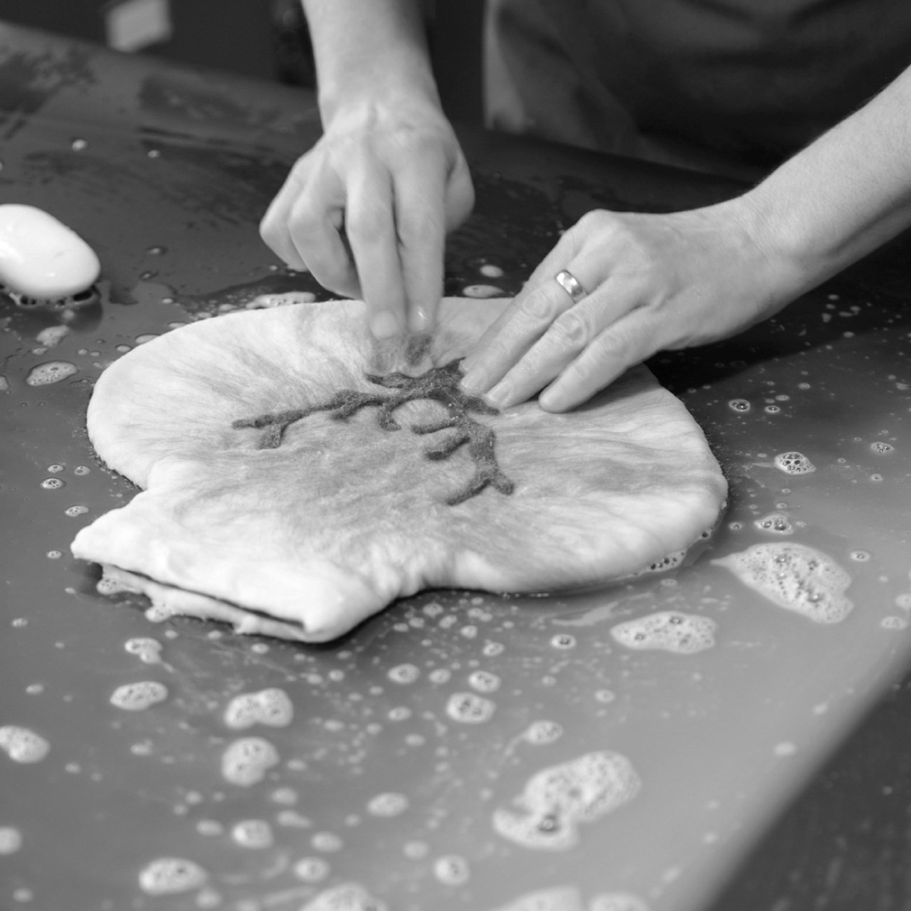 一つ一つ丁寧にフェルティングされており、デザインも一つずつ表情の違いを楽しめます。ヒツジの親子が寄りそっている優しい作品です。ボトルは安心のドイツ品質。fashy社製です。