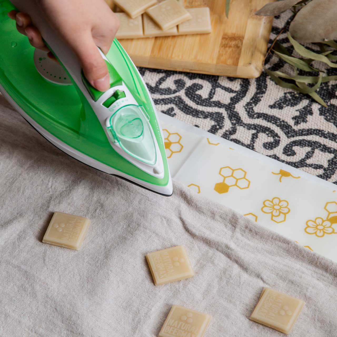 その上からアイロンをかけるとワックスキューブがゆっくりと溶けはじめます。全体にムラなく行き渡ったら上のクッキングシートを剥がして、アイロンの熱が冷めるまで待ちます。下のクッキングシートを剥がせば完成です。