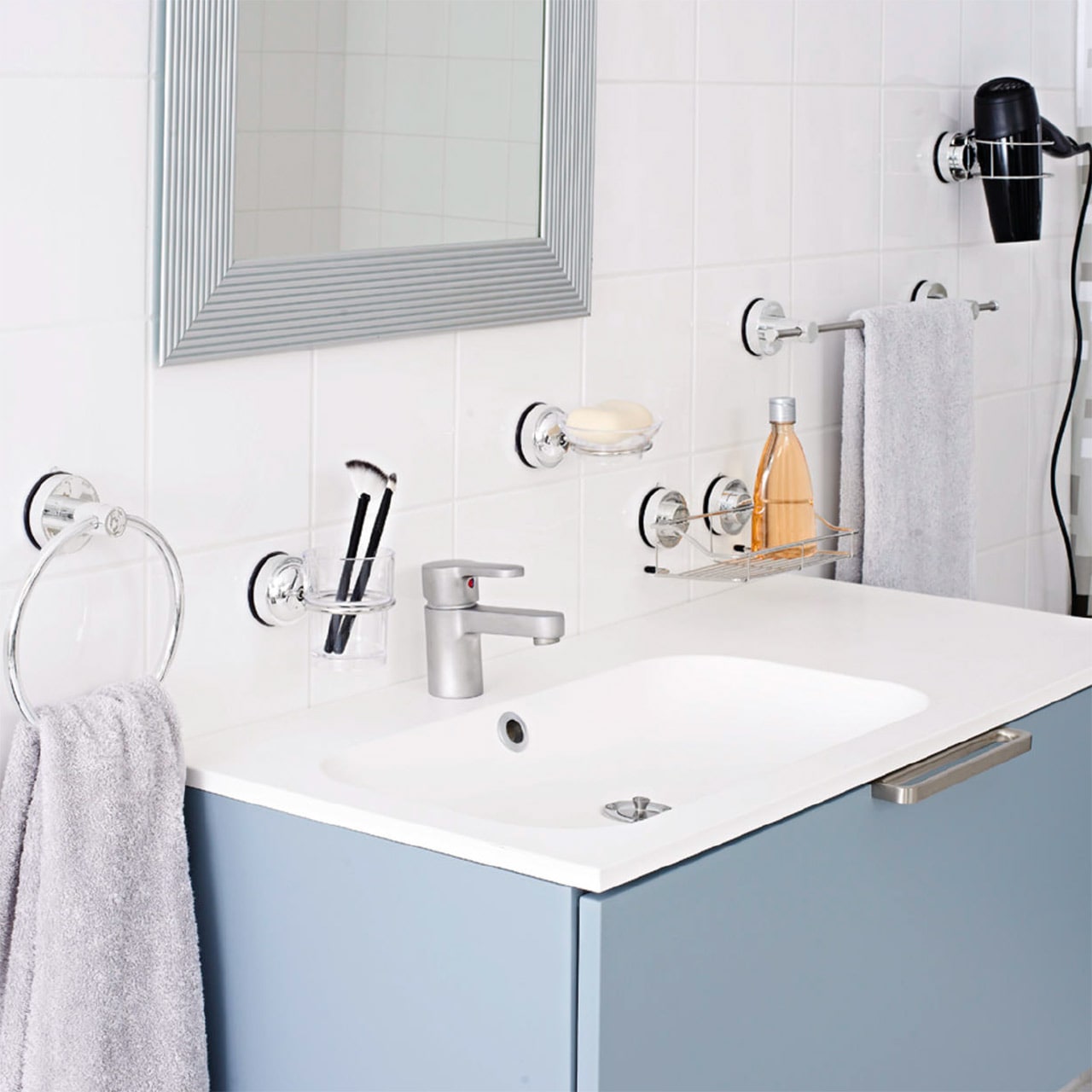 ミラーやシャワーレール、ソープディッシュ、歯ブラシホルダー、ヘアドライヤーホルダーなどサクションシリーズで統一すれば、ご自宅のサニタリースペースをシンプルでスタイリッシュな空間に演出できます。