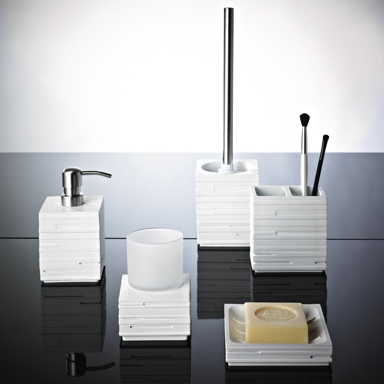 シンプルで品のあるデザインなので、様々な材質・色のバスルームや洗面台と調和します。