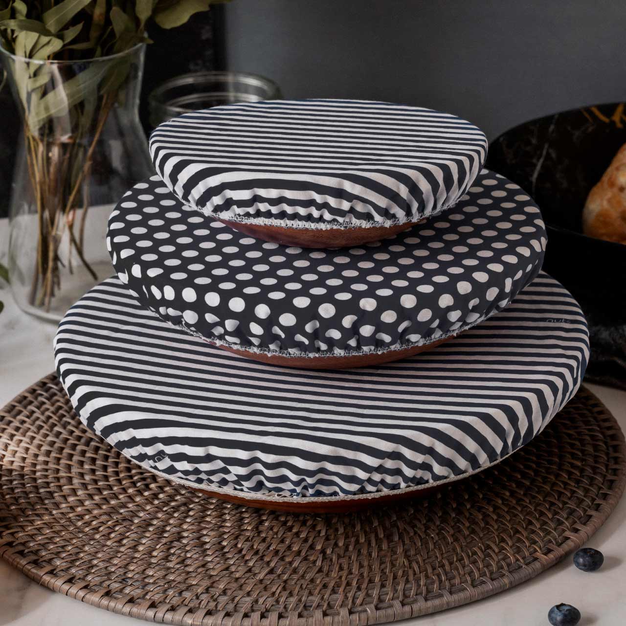 ブラックストライプ柄のボウルカバー(φ 27 cm x H 1.0 cm)が一枚入っています。直径27-32cmのボウルに取り付け可能です。