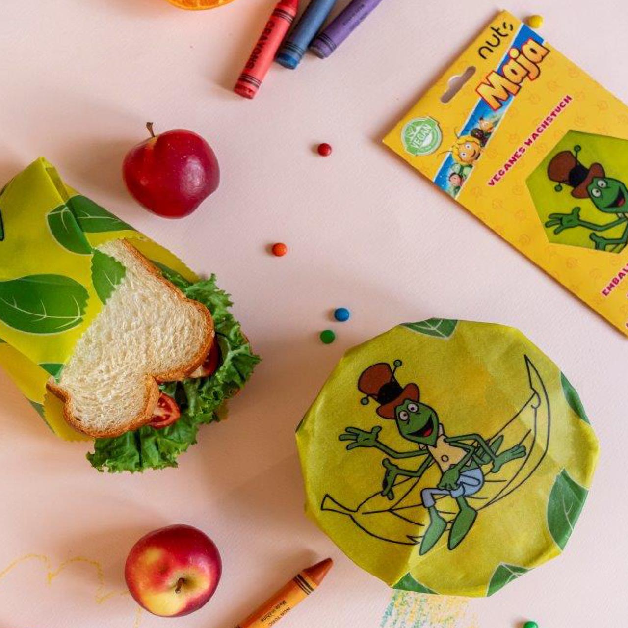 ドイツ作品「みつばちマーヤの冒険」のフィリップがデザインされたビーガンワックスラップ(25x25cm)が一枚入っています。