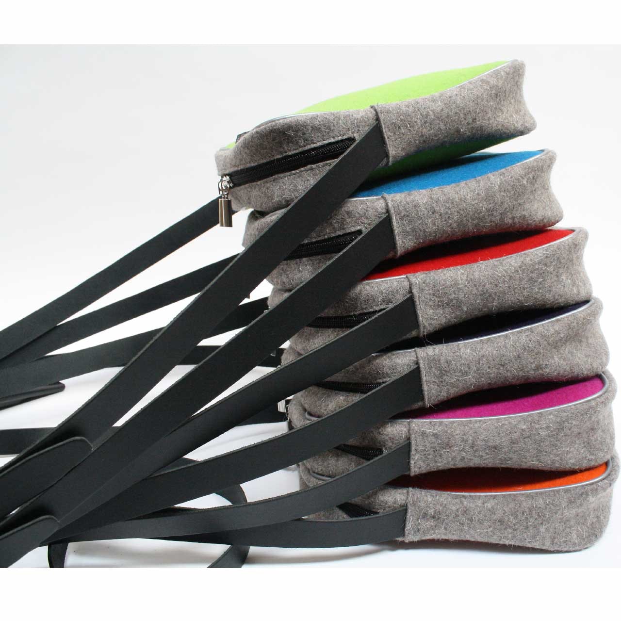 前面と背面は3mmのカラーフェルト、側面はグレーテクニカルフェルトで作られ、パイピングが施されています。