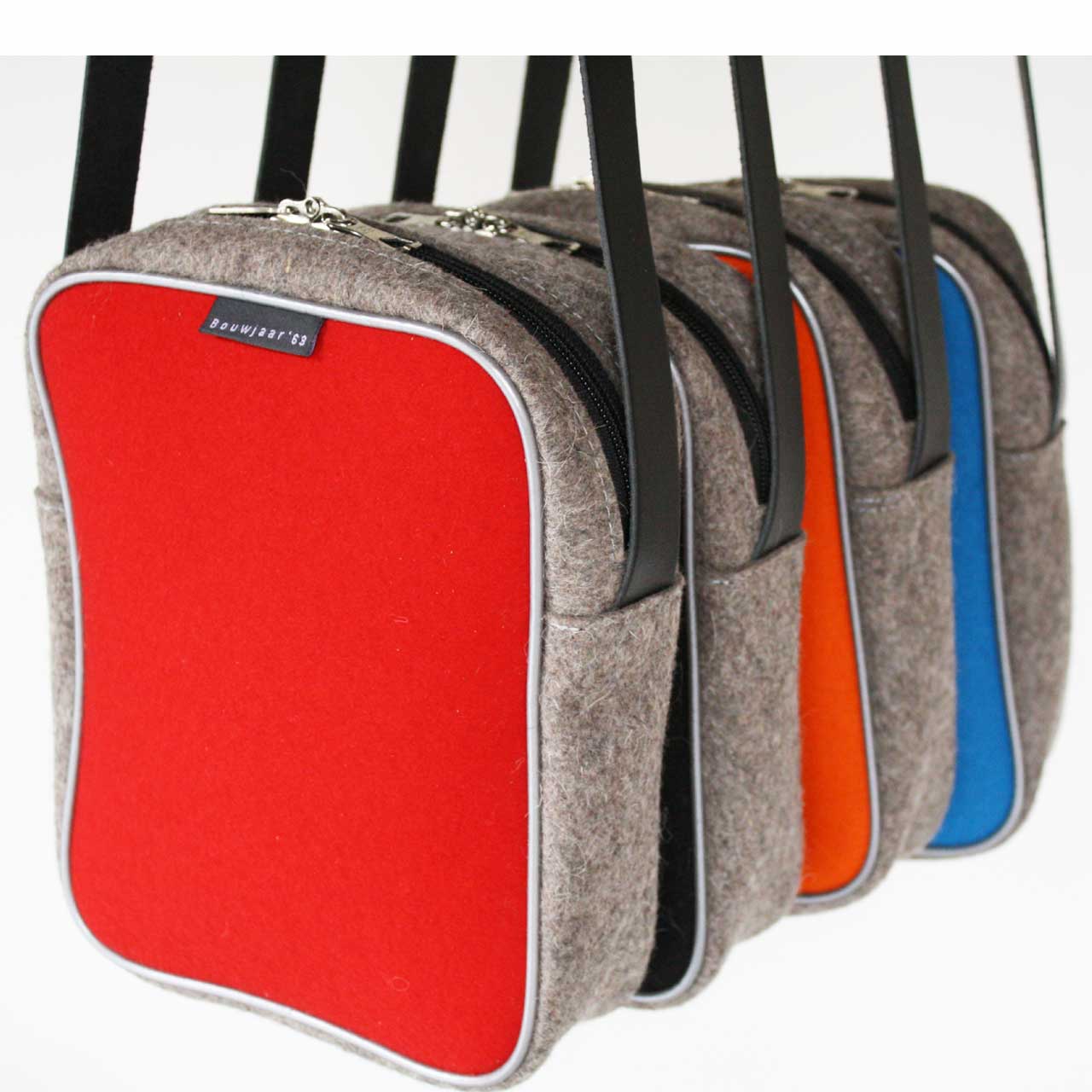 前面と背面は3mmのカラーフェルト、側面はグレーテクニカルフェルトで作られ、パイピングが施されています。