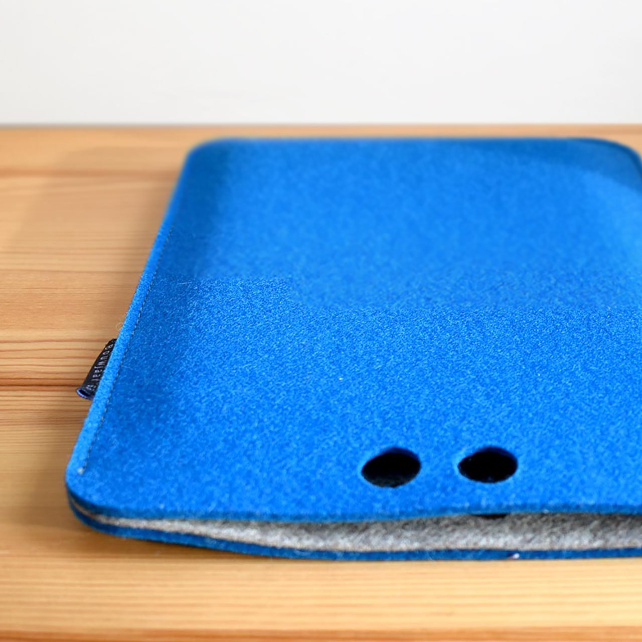 ipadスリーブ+ポケットは3mm厚の100%ウールカラーフェルトで作られたで丈夫なケースです。 真ん中のグレーテクニカルフェルトは2mm厚で、ケースを二つのキャビティに分けているので、片方にiPad、片方に付属品等を収納するのに便利です。 ダブルステッチなので片側のポケットは少し小さくiPad2などが収納可能です。 iPadは内部にゆったり収まり、上部の二つの穴を取っ手に持ち運びも自由自在です。