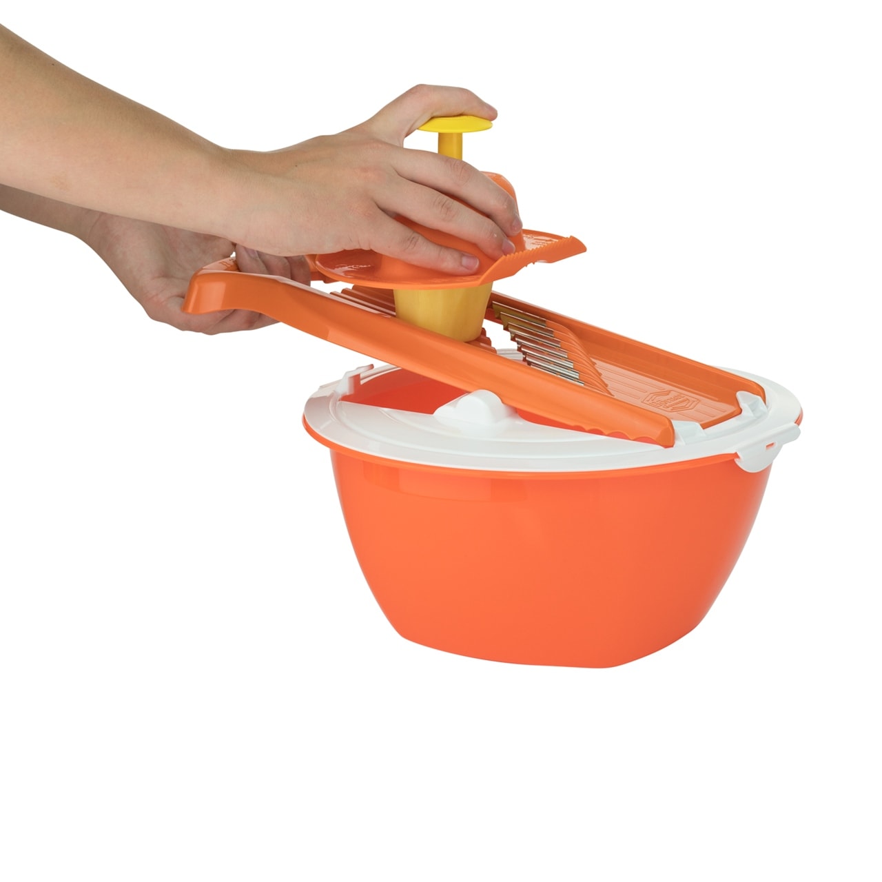 マルチプレートはボウルにしっかりとロックでき、ボウルはゴム製の滑り止め脚が付いているので、安全にストレスなく食材をスライスできます。