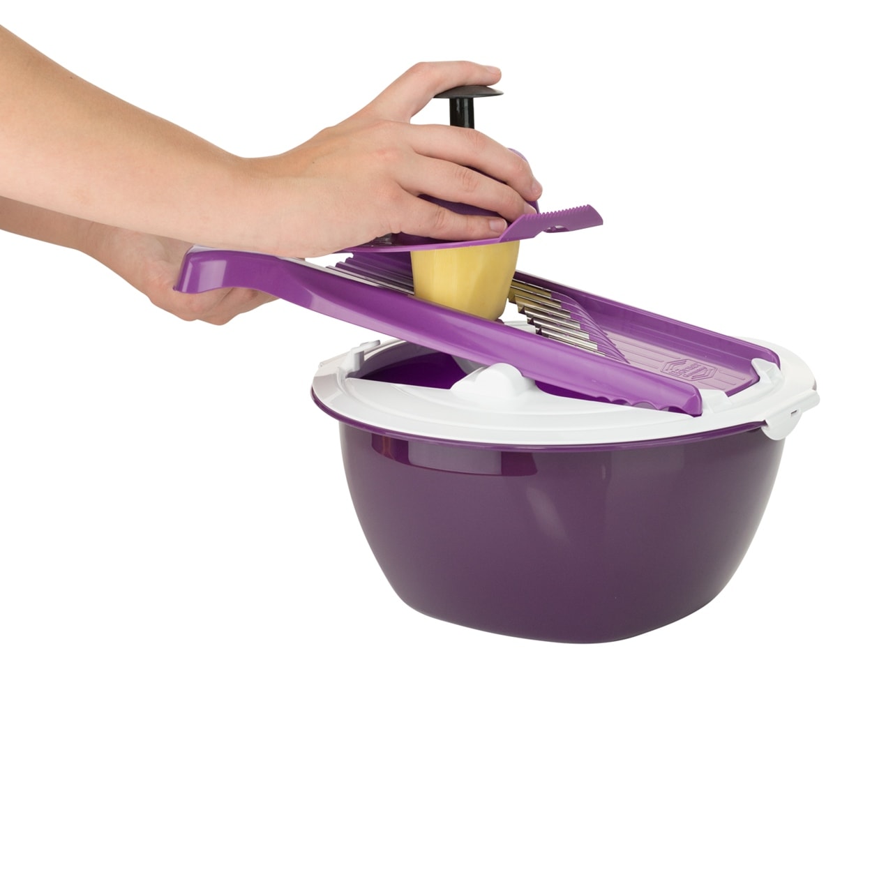 マルチプレートはボウルにしっかりとロックでき、ボウルはゴム製の滑り止め脚が付いているので、安全にストレスなく食材をスライスできます。