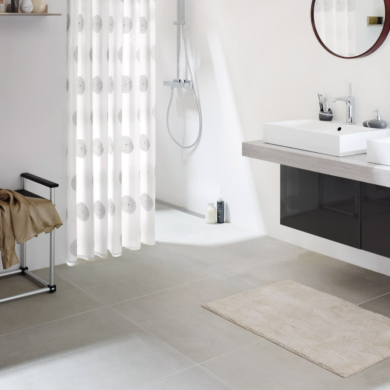 シンプルで品のあるデザインなので、様々な材質・色のバスルームや洗面台と調和します。