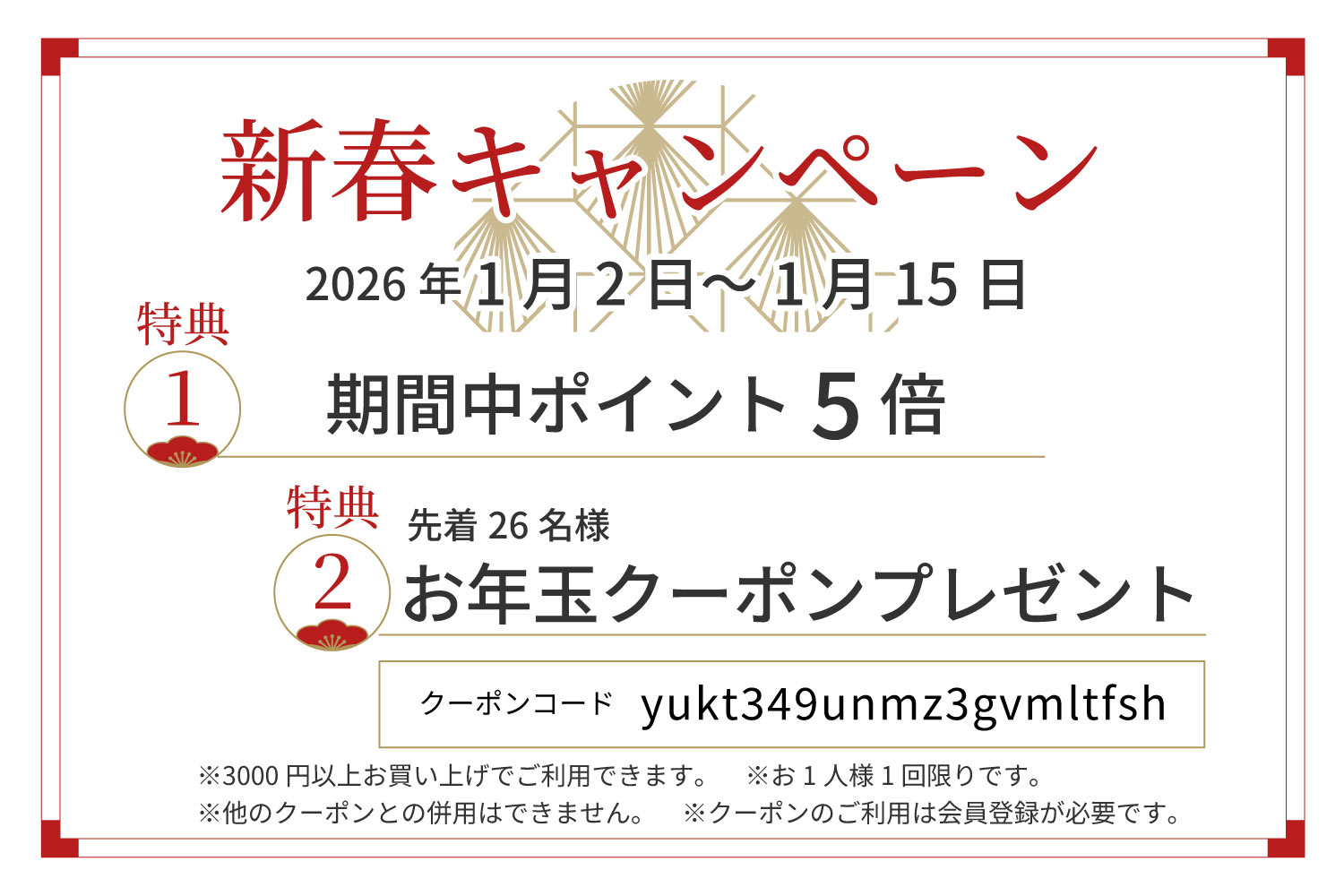 日頃のご愛顧への感謝と、今年もよろしくお願いします、の気持ちを込めて、お正月キャンペーンを開催します!お得にお買い物をお楽しみください♪