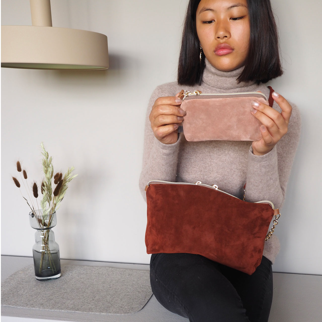 ソフィアは深みのある大人なカラーとシンプルながらも丸みのある可愛い形が印象的なシリーズ。スウェード生地を使った滑らかな質感とタッセル付きのファスナーが女性らしさを引き立てます。