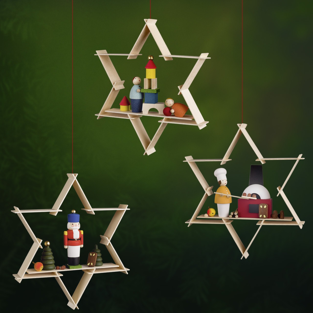 遠くから見ると星型のオーナメント。近付いてみるとその小さな枠の中に収まった精巧なフィギュアが豊かな物語を描いています。