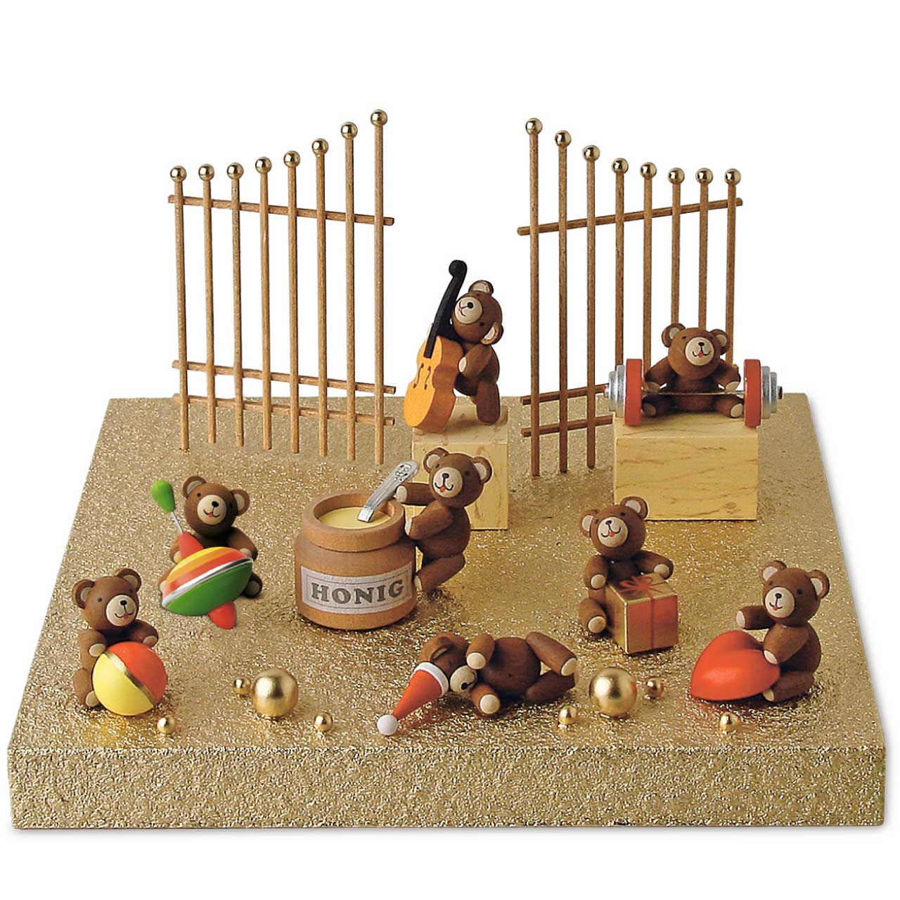 カラフルなコマを嬉しそうに抱えているベアーのかわいらしさが魅力的な作品。木目の温かみとベアーの表情に癒されます♪